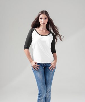 The Women's ¾ contrast raglan tee has a classic sporty look, but with a wider neckline. The three-quarter length raglan sleeves and ribbed cuffs at the neck set subtle contrasts. The single jersey is ideal for embellishing through printing.